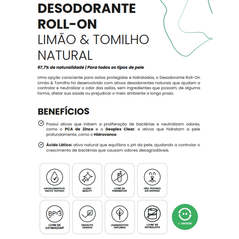 O Desodorante Roll-On Limão & Tomilho foi desenvolvido com ativos desodorantes naturais que ajudam a controlar e neutralizar o odor das axilas, mantendo-as protegidas e hidratadas.