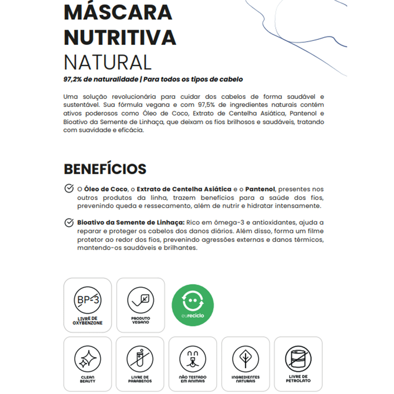 Composição: Água, Beenamidopropil Dimetilamina, Álcool Cetoestearílico, Monoestearato de Glicerila, Cloreto de Cetrimônio, Brassica-Amidopropil Dimetilamina, Cloreto de Beentrimônio, Glicerol, Dimeticona, Óleo de Coco, Extrato da Semente de Linhaça, Extrato de Centella asiatica, Algina, Citrato Oleato de Glicerila, Triglicerídeo Caprílico/Cáprico, Pantenol, Betaína, Dibenzoato de Propilenoglicol, Ácido Lático, Acetato de Tocoferila, Gluconato de Sódio, Etilhexilglicerina, Fenoxietanol, Benzoato de Sódio, Sorbato de Potássio, Perfume, Alfa-Isometil Ionona, Cumarina, Hexil Cinamal.